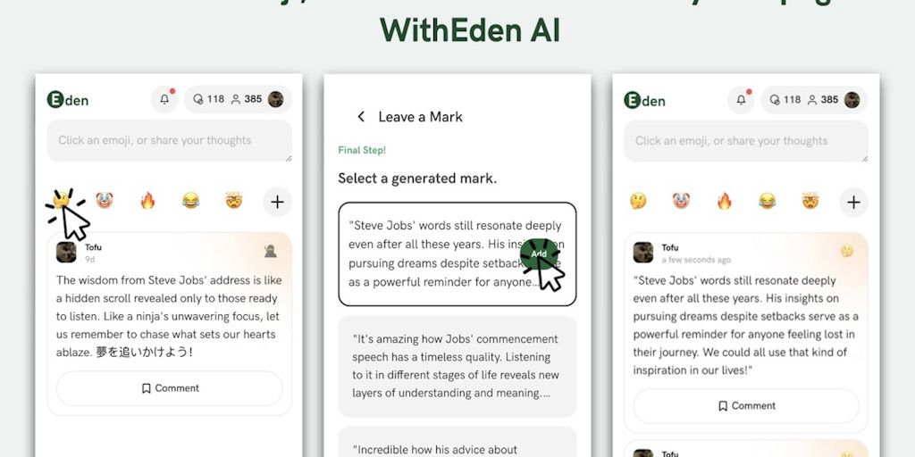 Eden is an AI-powered social plugin that allows you to comment on any webpages by clicking emojis. Our AI summarizes the page and creates tailored comments. Roast a friend, love a webpage, or drop a q