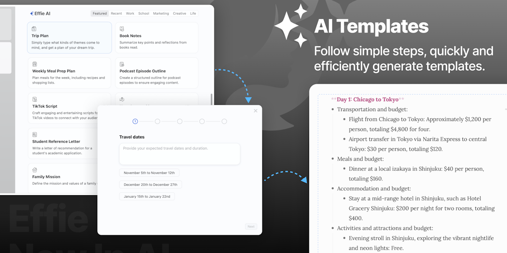 Effie is your writing companion to unleash your creativity. With a simple interface, 1000+ inspirational prompts, and AI-powered templates, Effie helps you get into flow state effortlessly. Cross-devi