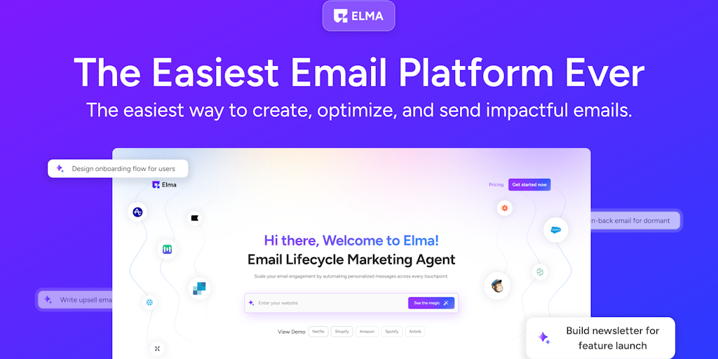 Elma turns your prompts into ready-to-send email campaigns in minutes. Generate high-converting emails in your brand tone, optimize subject lines, and automate flows without any manual effort.