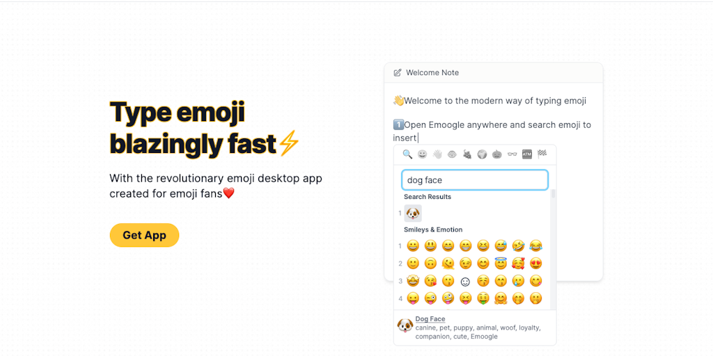 Emoogle is the revolutionary emoji desktop app that provides the fastest way to type emoji, as easy as using a keyboard shortcut, and offers the best emoji search engine, giving you a Google-like sear