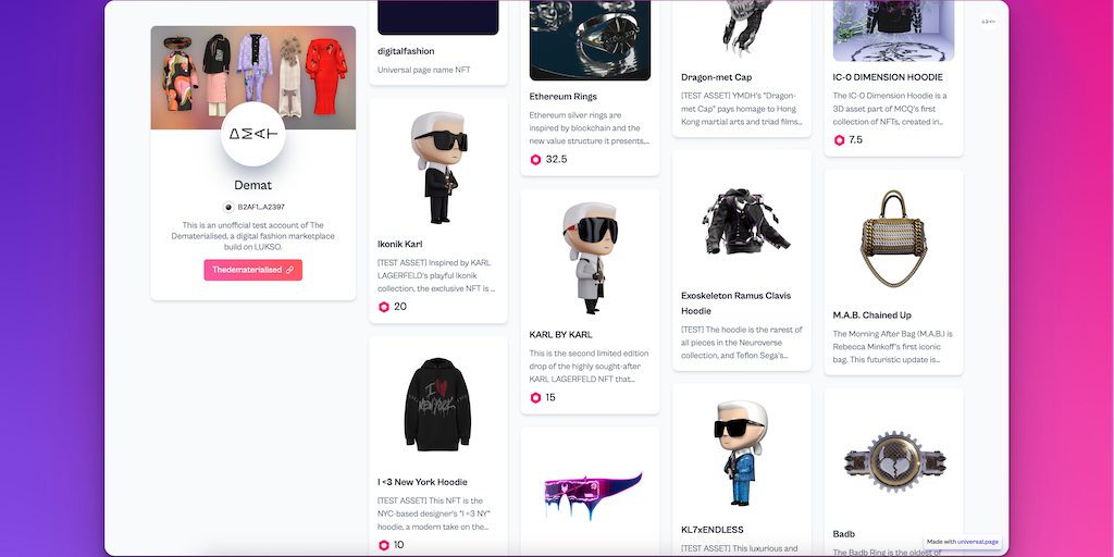 Universal Page is an all-in-one NFT platform that focuses on user experience and creativity. Build your own custom web page, trade NFTs on the (gasless) marketplace, or drop your own collections with