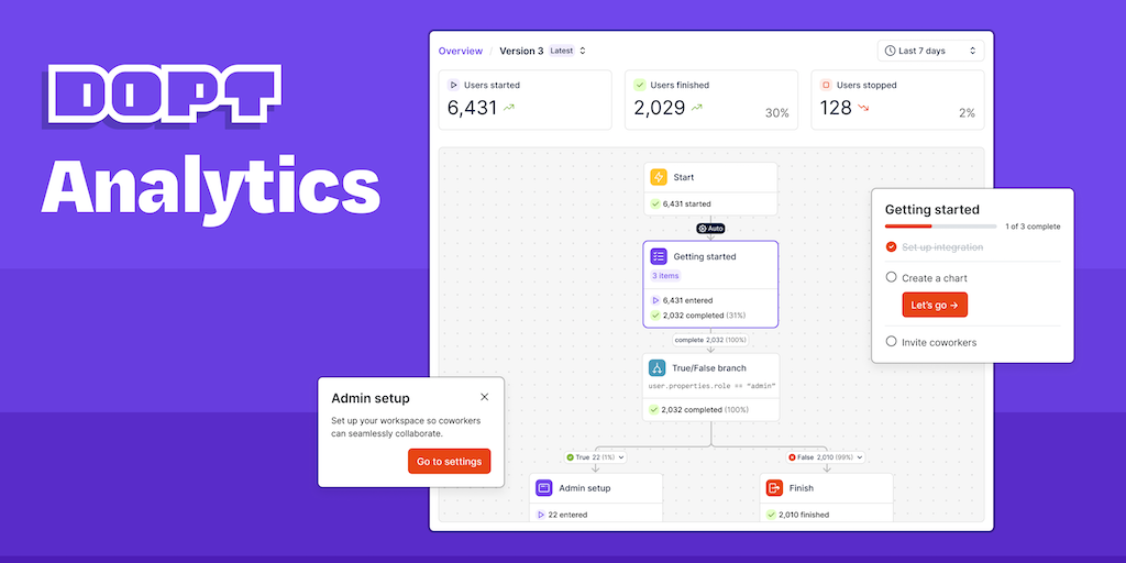 Out-of-the-box analytics for the product onboarding and education flows built with Dopt. See overall flow performance, which paths users take, step-level conversion, and drop-off. Analytics helps you
