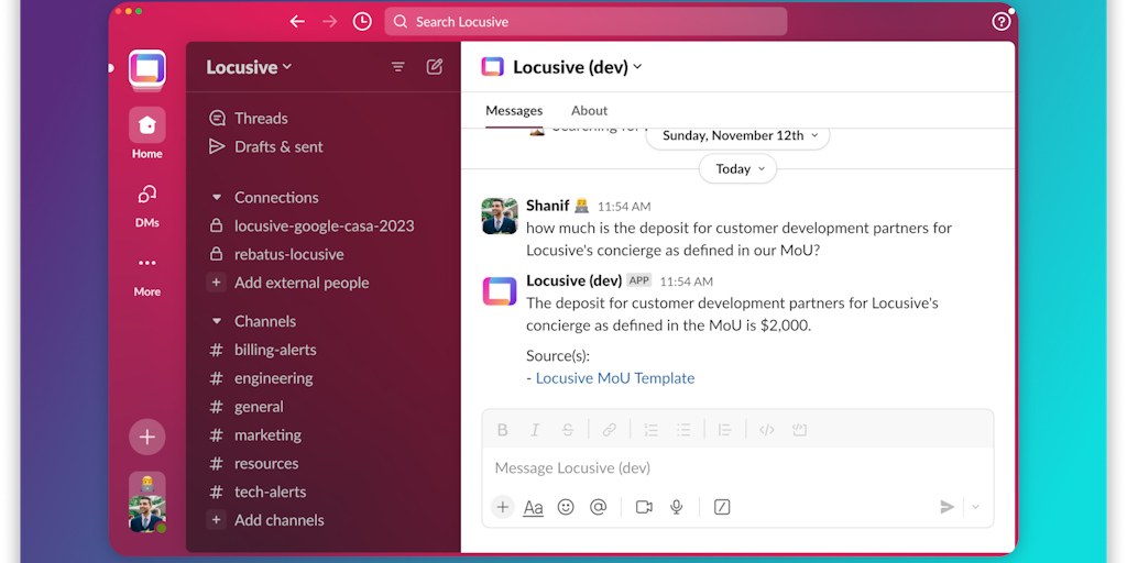Locusive's Free Chatbot For Slack - A chatbot that helps you find answers from your trusted docs | Product Hunt