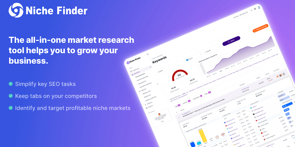 Niche Finder is an All-in-one SEO tool for in-depth market research, keyword discovery, and competitor analysis. With a user-friendly interface, it simplifies the complex process of uncovering profita