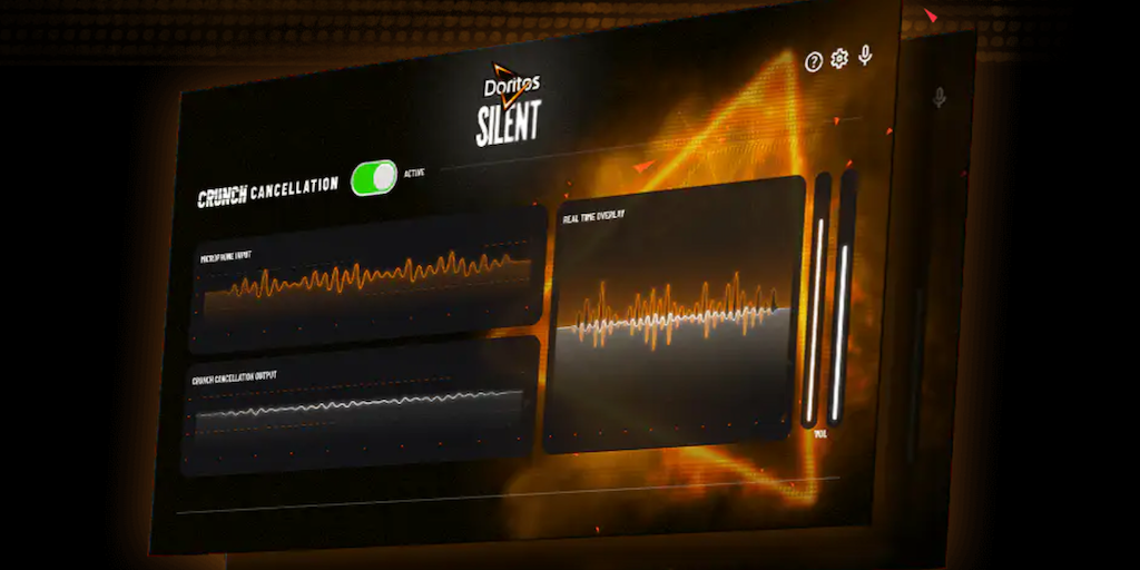 Doritos' Crunch Cancellation software silences the sound of the Doritos crunch. You can eat Doritos without distracting your gaming squad or voice chat party. It's powered by AI trained on over 5,000
