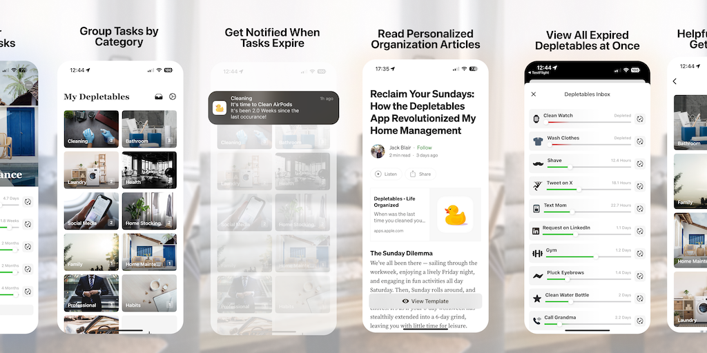 When did you last clean your phone? Or changed your bedsheets? Depletables makes those questions a thing of the past. We track your recurring tasks and notify you before you even need to think about t