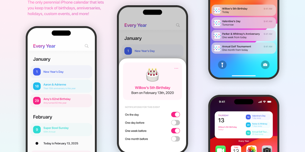 The only perennial iPhone calendar that helps you keep track of birthdays, anniversaries, holidays, custom events, and more! Never miss an important date again.