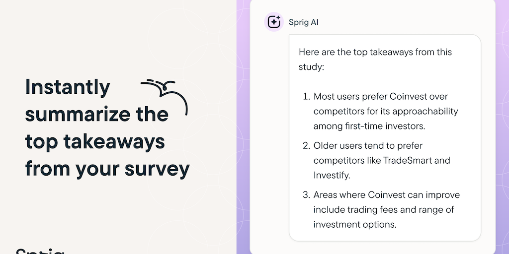 Say hello to effortless survey insights with Sprig AI Analysis for Surveys. Skip the manual analysis with an instant summary of your survey’s top takeaways. Want to dig deeper? Sprig AI can even answe