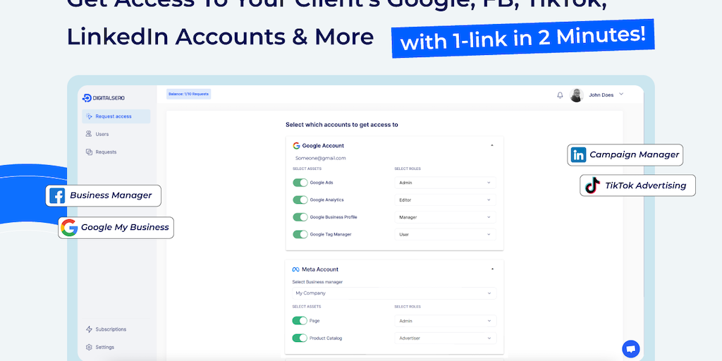 🚀 Digitalsero empowers marketing agencies and digital marketers to access their clients' Google, Meta, TikTok accounts & more with 1-link in 2 mins! ✅ No more juggling login credentials or wasting hou