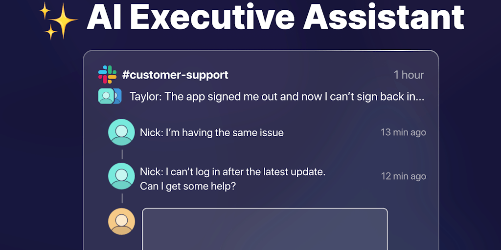 Your AI Executive Assistant works alongside you in Slack: 📚 Summarizing long conversations and extracting to-dos ✍️ Auto-drafting replies to help you save an hour per day