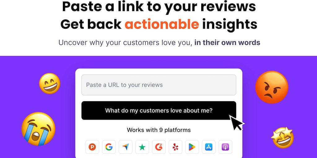 Uncover why your customers love you, what pain they had, and what makes you unique. Mine My Reviews can analyze 1000 reviews in 60 seconds.
