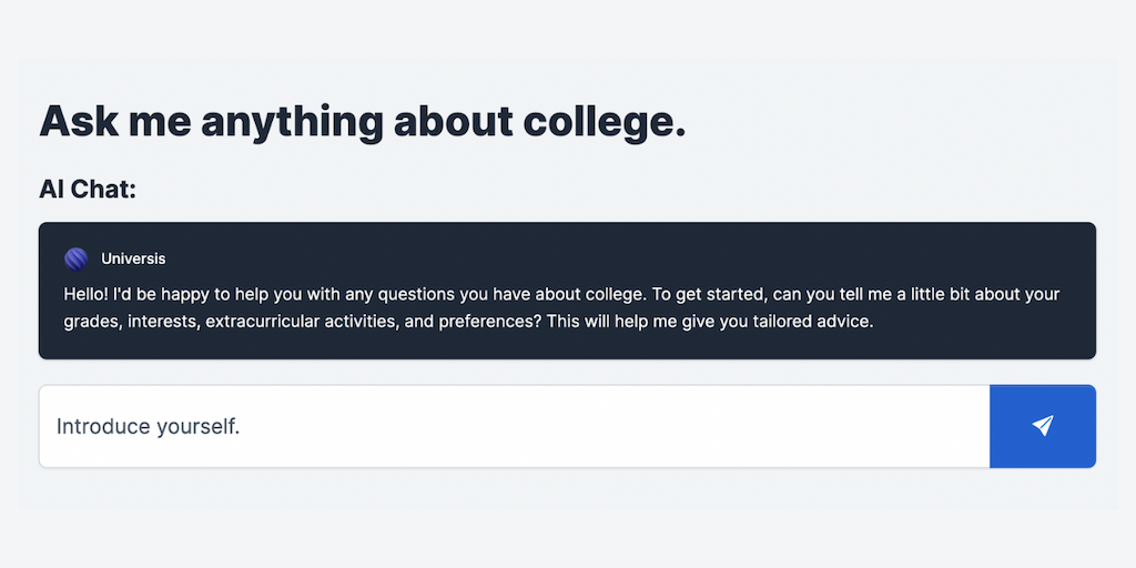Universis is your very own AI College Admission Counselor that provides you with personalized guidance to get into the college of your dreams! Ask it anything, let it review your college essays, and g