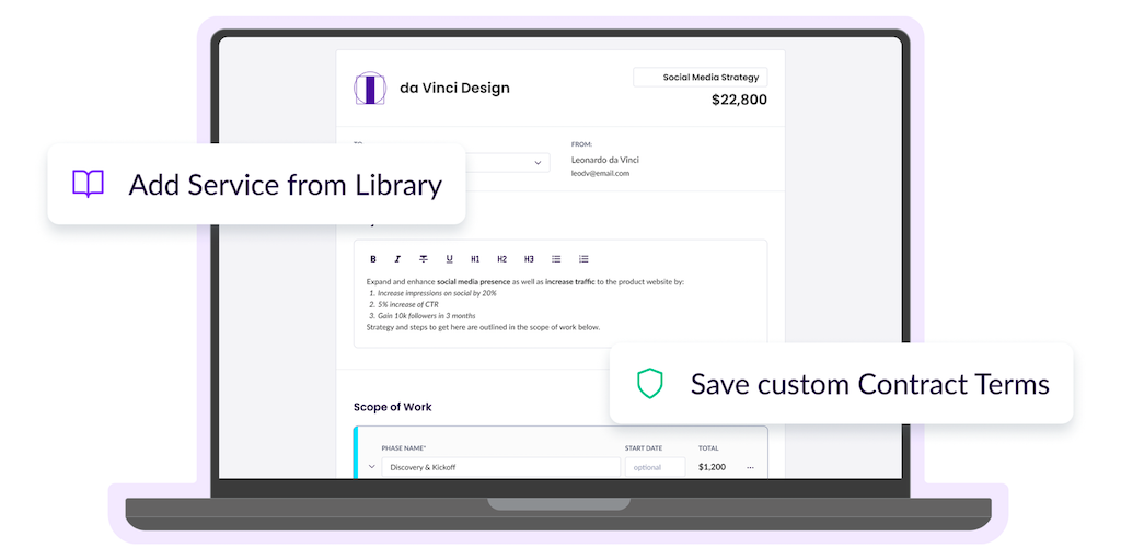 Take your proposal time from hours to minutes with Wethos' libraries of crowdsourced scopes of work with pricing recommendations, pre-built services, and detailed contract terms templates. Proposals i