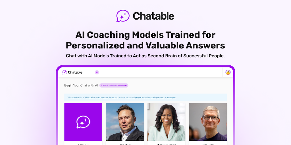 Chatable allows interaction with AI coaching models trained to act as the second brain of successful people like Elon Musk, Michelle Obama, Tim Cook etc. You go through their thought process, receive