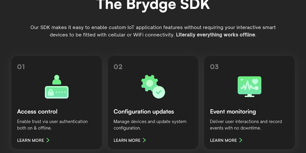 Brydge is an IoT SDK that connects offline devices to mobile apps using BLE, creating a secure connection and preventing data loss.