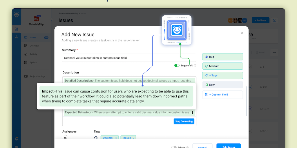 Bugasura AI is a smart add on to the Bugasura issue tracker that allows you to unlock the impact of the bug on your customer and software. It also helps you reduce redundancy by detecting similar issu