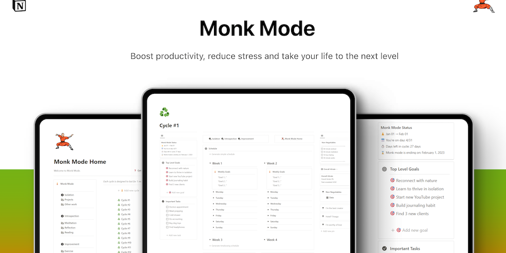 Use the Monk Mode methodology to improve your life in 31 day Monk Mode cycles and use this lightweight and digital planning system to get the best results.