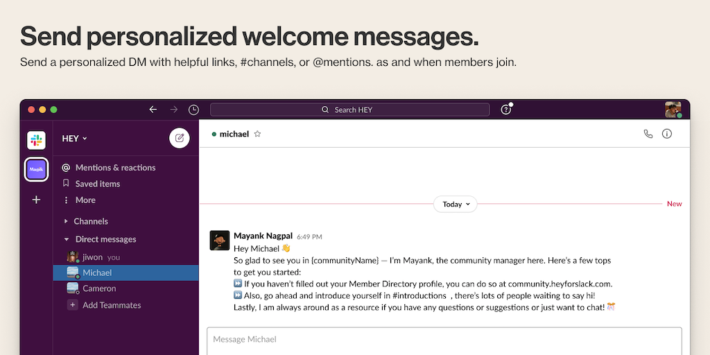 Your community wants to hear from You (and not a bot). ✨ Send a personalized message with helpful links, #channels, or @mentions in their DMs when they join. ✨ Schedule messages delivered minutes, hou