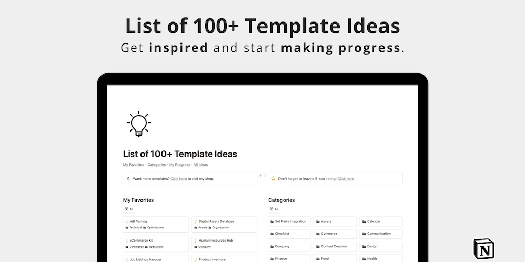 Get inspired, take action, and start making progress with your Notion template business. This template has 100+ of the best ideas to help you stop wasting time and start creating an income online.