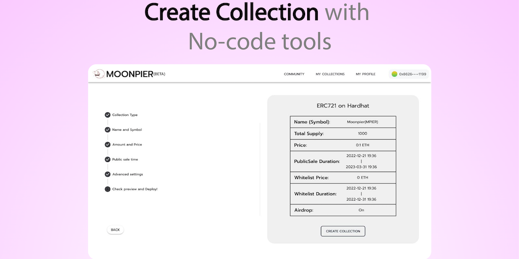 MoonPier is a no-code NFT platform where the creator can create an NFT collection without coding and even art design as easy as writing a blog. The creator can find incredible artists on MoonPier and