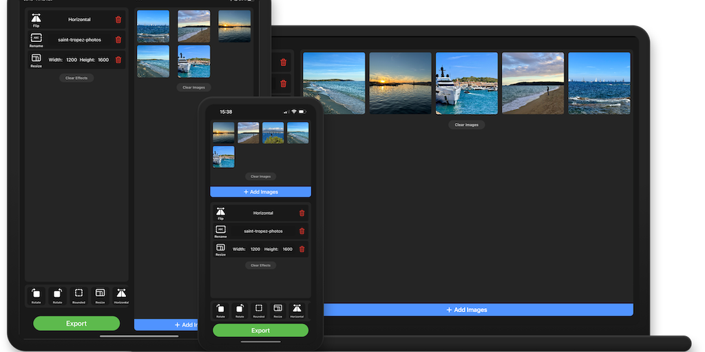 Import images from your device. Add a list of effects including rotate, flip, resize, corner radius, rename and more. When you press 'export' all effects will be applied to all of the imported images,