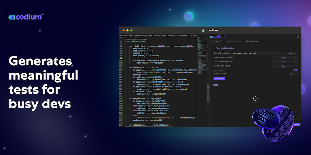 CodiumAI analyzes your Python, JS, or TS code and generates meaningful tests to catch bugs before you ship. With CodiumAI, you can easily and quickly generate comprehensive test suites that help you e