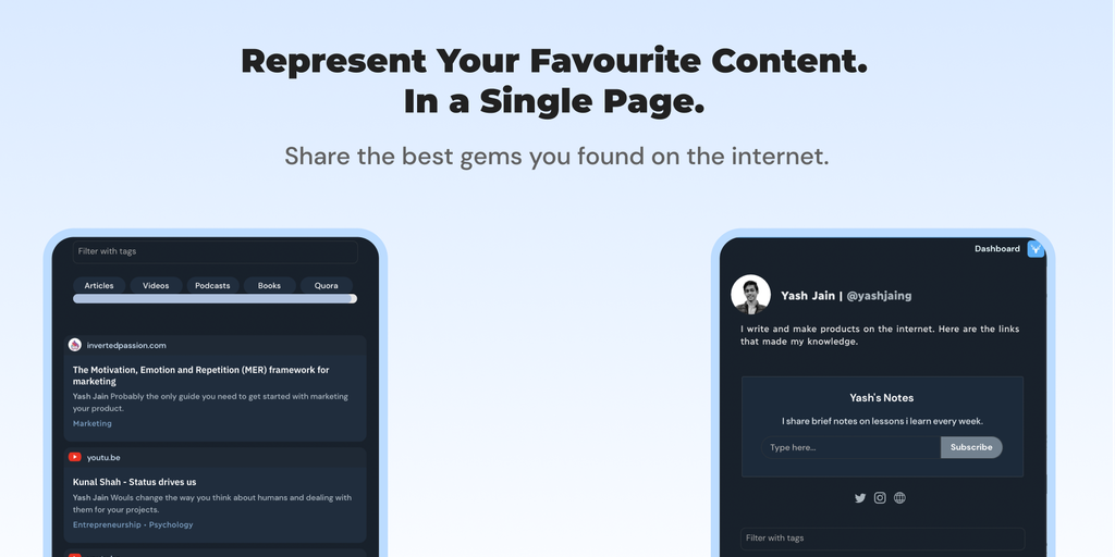 We want to crystalize your most-favourite content and let you represent it to the world! Share your Profile with your audience whenever they ask for recommendations. Collect E-Mails and add your socia