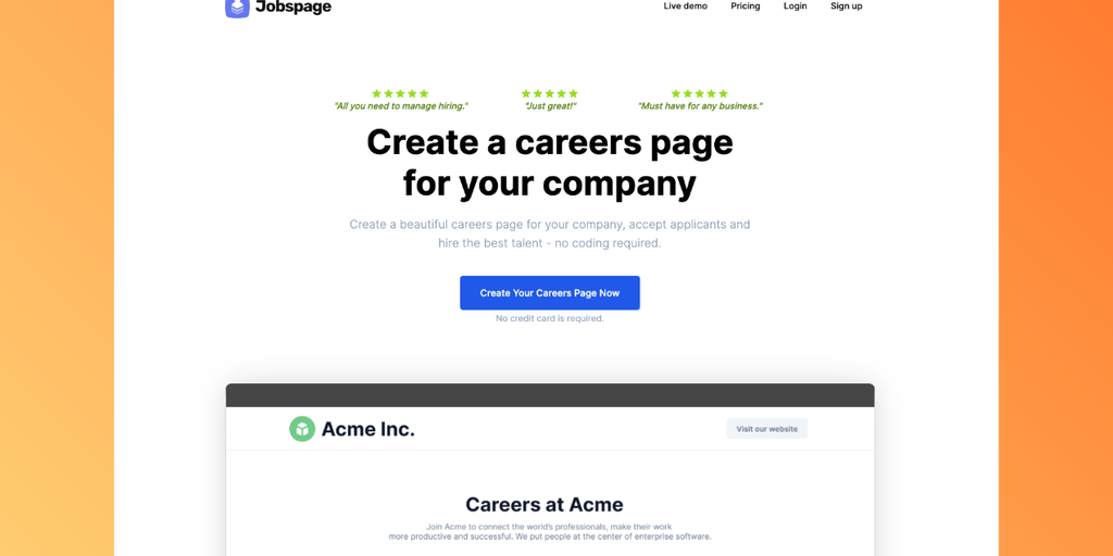 Jobspage lets you create a dedicated careers page for your company, list available jobs, and receive applications - all in one app. With our applicant tracking system, you can collect candidate resume