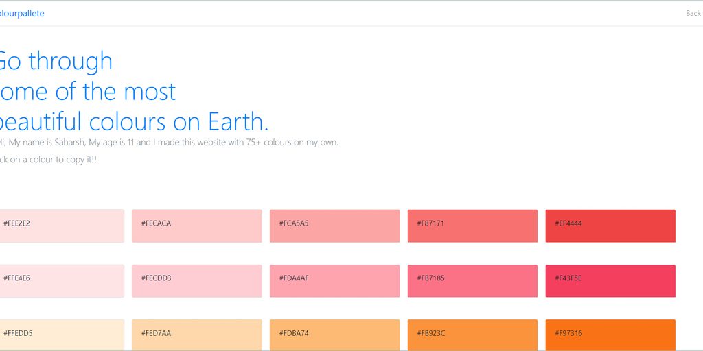 Hi, I am Saharsh. I am a 11 year old and have made this product. Pick up your favorite color palette and drop it into your CSS to match the latest design trends with ease. Colour palette is a collecti