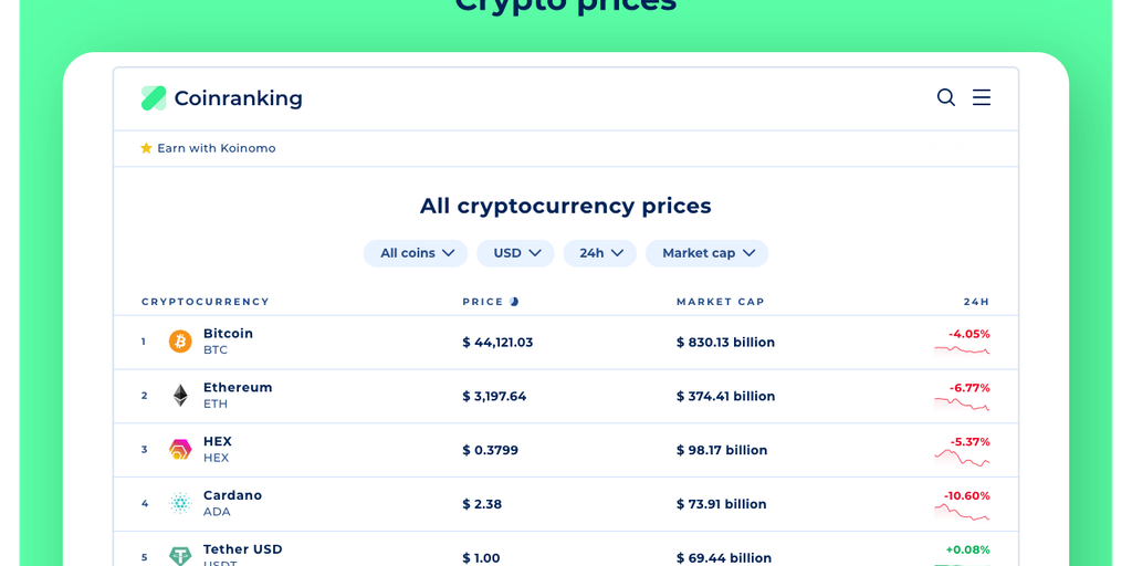 Coinranking is the simplest website to check prices of cryptocurrencies like Bitcoin, Ethereum, and many more. With its beautiful interface, the website attracts both newcoiners and crypto fanatics.