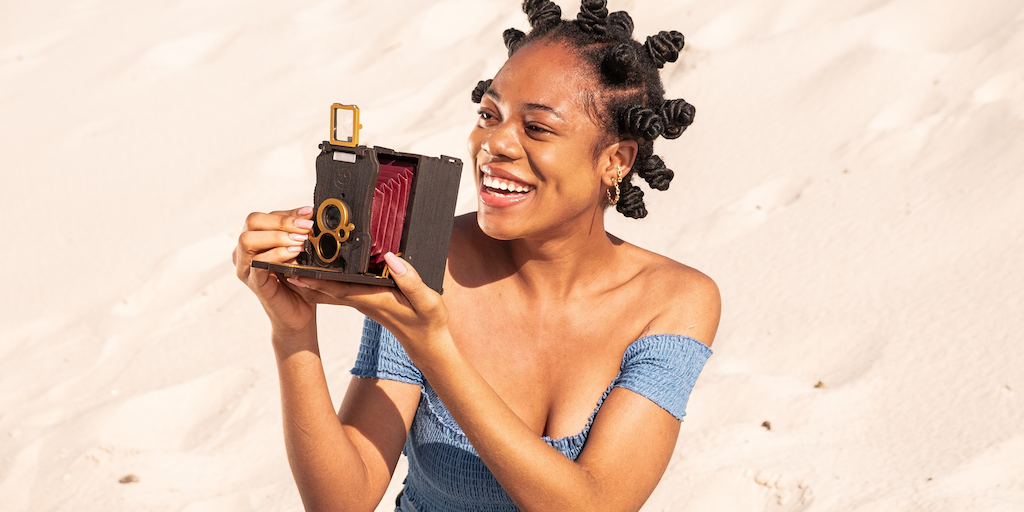 A Fujifilm instax camera that combines a vintage steampunk design with a pinhole, bellows, exposure calculator, manual development system, and environmentally friendly materials. Craft it glue-free an