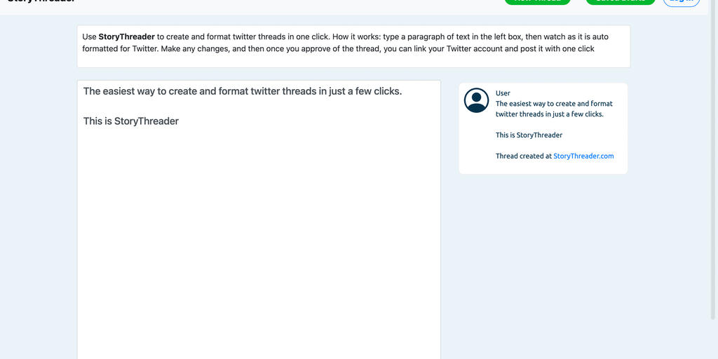 Use StoryThreader to create and format twitter threads in one click. Type a paragraph of text in the left box, then watch as it is auto formatted for Twitter. Make any changes, and then once you appro