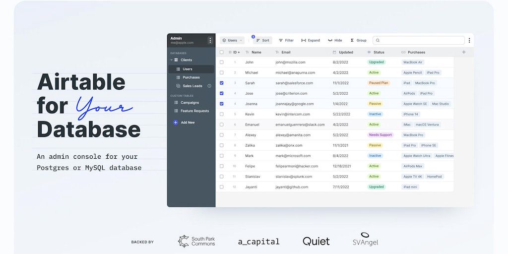 Plato is Airtable for your SQL database — an out of the box admin panel for customer support, customer success, and manual ops at your startup. 🔎 Visual queries. No SQL. ✍️ Track new data with virtual