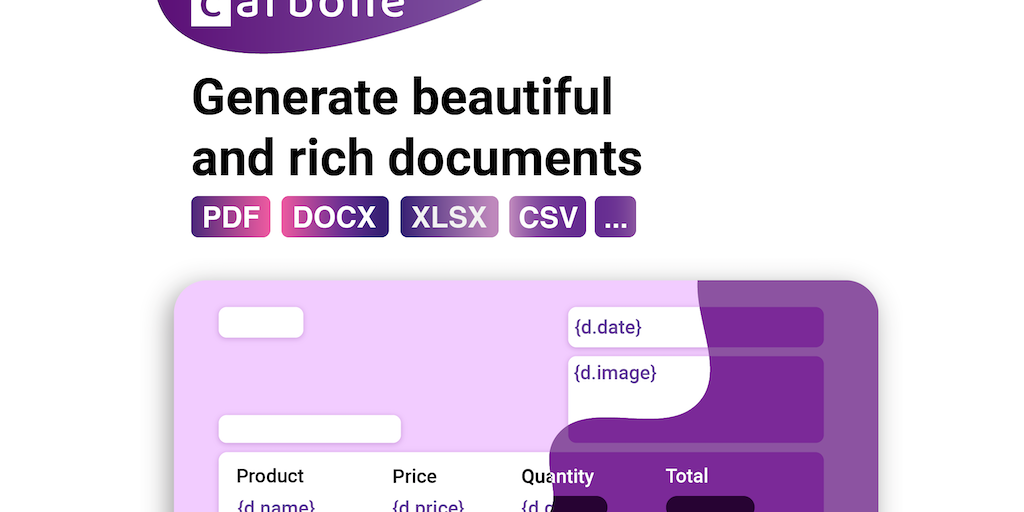 Automate the generation of documents from a universal templating engine. Create templates with your favourite text editor, and add dynamic content with Carbone tags (text, colours, images, graphs). An