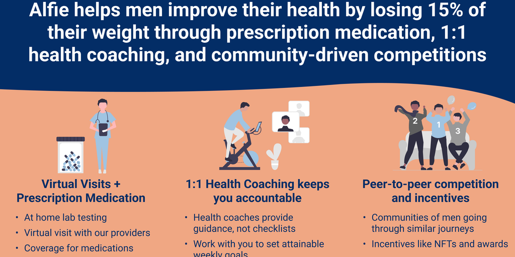 Alfie helps men lose 15% of their weight through virtual visits with providers and prescription medication, highly personalized coaching from certified male health coaches, and a P2P community of men