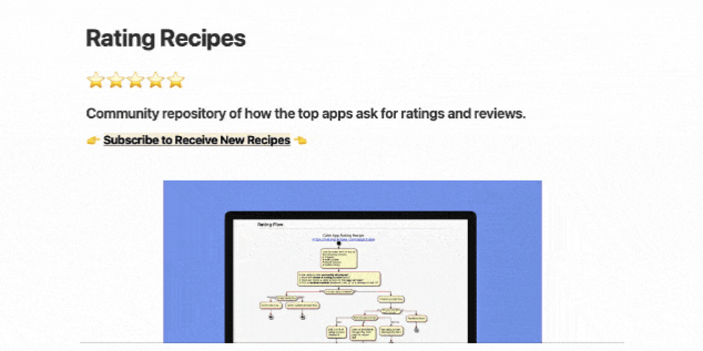 Rating Recipes is a repository of how the top apps ask for ratings and reviews. We analyze apps like DoorDash, Hulu, Calm, Etsy, and many more. They contain detailed user flows with screenshots and co