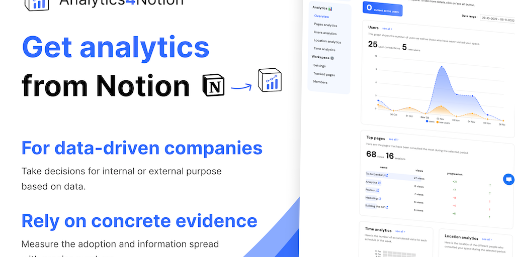 Analytics4Notion is an easy and complete analytics tool for companies which use Notion to share informations. - Get stats on the use of your teams or clients - Work collectively - Identify hot content