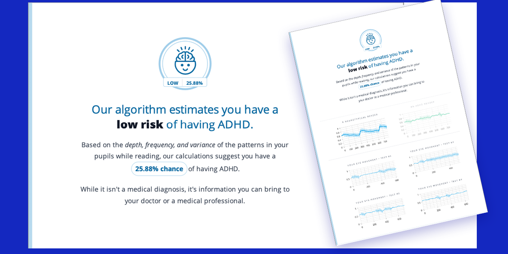 An objective and empirical evaluation that detects the distinct eye movement pattern found in persons with ADHD. The ADHD Test ends with a personalized report if you have a low, moderate, or high chan