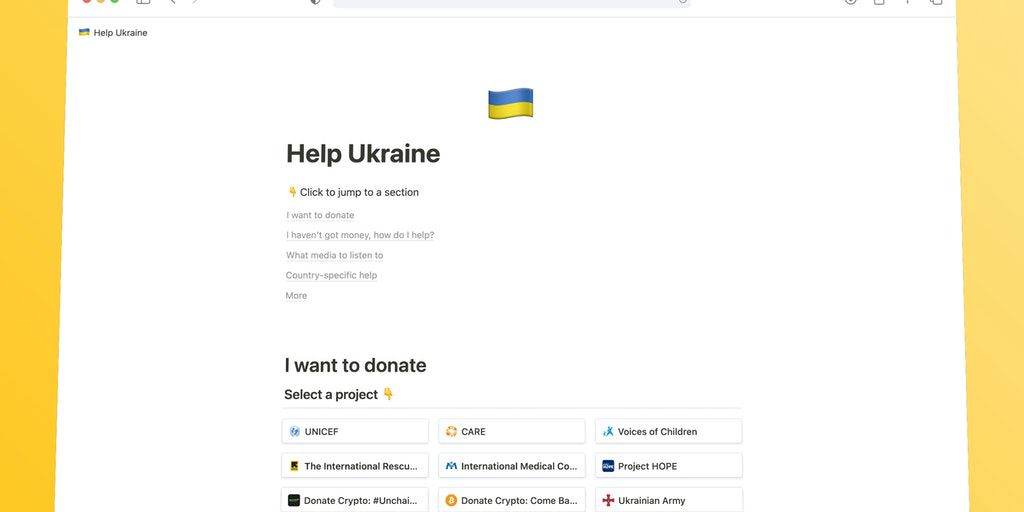 An interactive list where we can all crowdsource all the information, donation links, how to help without money, etc Ukrainian people need us now more than ever. Inside, you can submit your own resour