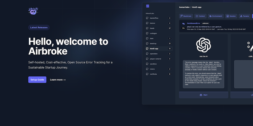 Airbroke is a self-hosted, PostgreSQL-based error tracker. It's lightweight, open-source, and compatible with Airbrake, offering a cost-effective solution for startups.