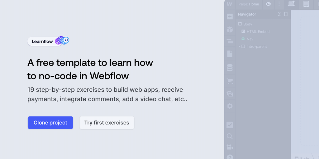 Learnflow is a project to clone in Webflow, made of 19 step-by-step exercises to learn how to integrate popular No-code tools. Webflow acts as the platform to glue it all. The project is free, thanks