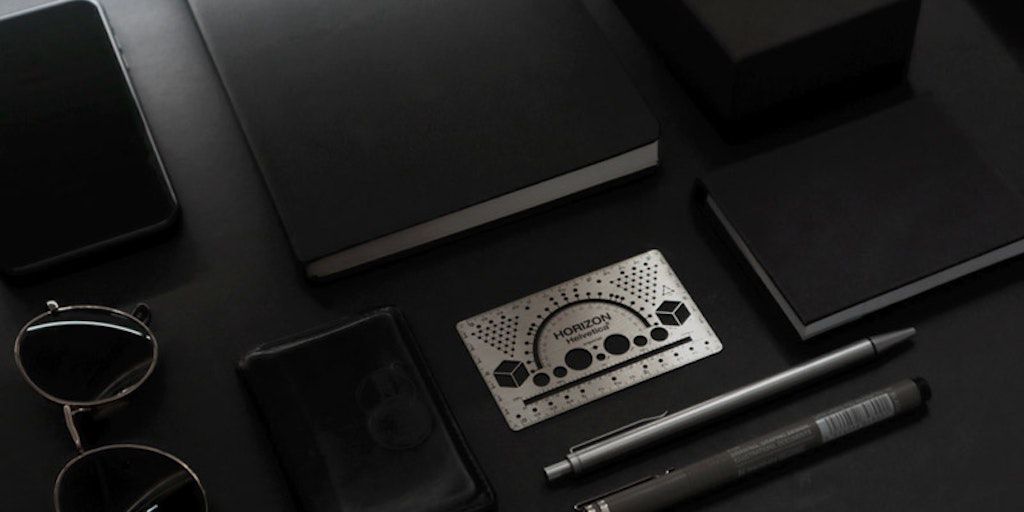 Horizon Helvetica® is a credit card size, multi-functional stainless steel sketching tool. Inch & Cm & Pixel & Pica ruler, compass, protractor, t-square, isometric grid, and more—all in your wallet wi