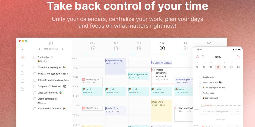 Routine (YC W21) is a productivity desktop & mobile app that helps you take back control of your time. 💾 Centralize all your tasks (email, chat, project management) 📅 Plan your work (schedule, postpon