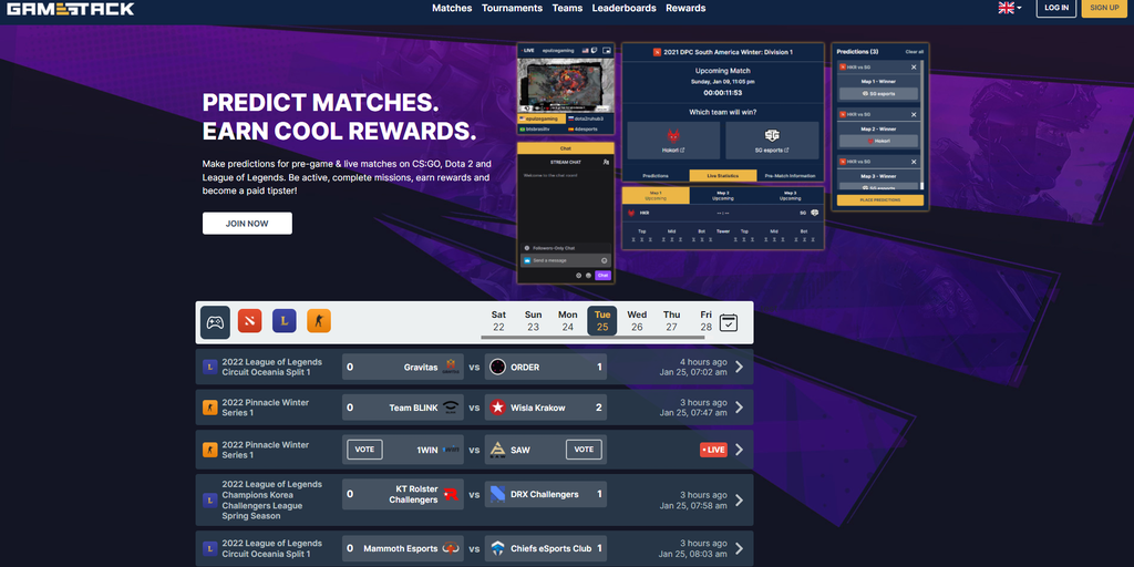 GameStack is a Social eSports Tipster Service where users can: Vote on outcomes in eSports games, watch live matches and check stats of tournaments, teams and players. Earn Diamonds to redeem rewards
