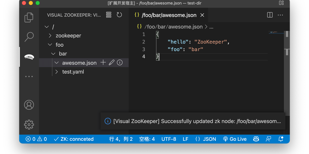Visually manage your ZooKeeper in Visual Studio Code. Features๏ผ 1. ๐ Edit and view data on ZooKeeper using the powerful VSCode editor. 2. ๐ View node statistics info. 3. ๐ Add nodes directly from the