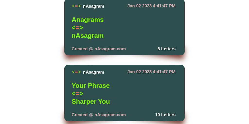 nAsagram is an innovative web app to create anagrams interactively. You can create anagrams of phrases with multiple words and up to 70 letters in length. An anagram can also easily be shared on your