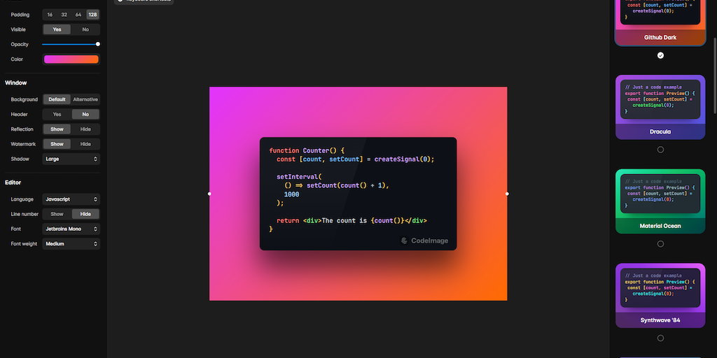 CodeImage is a web application that allows you to manage your code snippets and beautify them quickly to share it everywhere. CodeImage is an open source side project born thanks to the SolidJS hackat