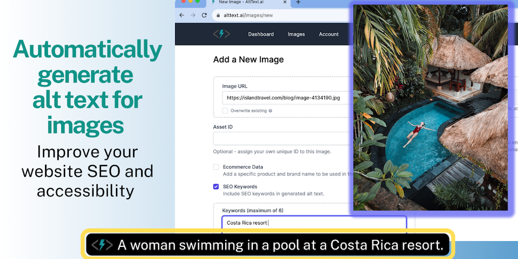 Let AI write your alt text, automatically. Improve your SEO and site accessibility with AI-generated alt text in over 130 languages. Integrations for WordPress, Shopify, Contentful, web, and API.