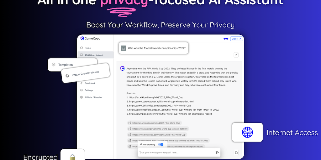 CamoCopy is a privacy-centric AI assistant, born in Europe. Boost your productivity with an AI that respects your privacy, has web access, and creates content effortlessly. GDPR-compliant, encrypted,