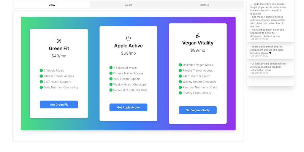• AI generate & iterate on UI components, with live preview • React + Tailwind + shadcn/ui components + lucide icons • Open-source • Project inspired by vercel's v0.dev (which, at time of writing, is